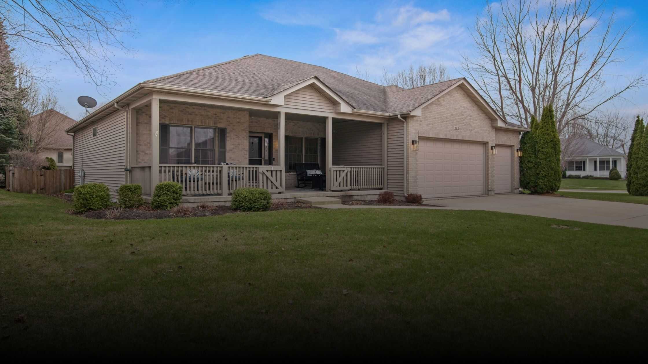 Welcome to your dream ranch in Hampshire Meadows! This custom-built 3-bedroom, 2-bathroom gem sits proudly on a landscaped and fenced corner lot, complete with a charming front porch, backyard patio, concrete driveway, and a coveted 3-car garage. Step inside and you'll find an open floor plan designed for comfortable living and stylish entertaining. The living room features a soaring cathedral ceiling and a brick fireplace with gas logs-cozy and grand all at once. The eat-in kitchen is a showstopper with maple cabinetry, tile backsplash, walk-in pantry, breakfast bar, and plenty of space to fuel your culinary creativity. A separate dining room and a bright family room-complete with sliding glass door to the patio-make hosting a breeze. Hardwood floors, solid wood doors, and detailed trim add warmth and character throughout. The primary suite is your private escape with a cathedral ceiling, walk-in closet, and a spa-like bath featuring a whirlpool tub, separate shower, and double bowl vanity. Full basement offers room to expand. All this, and just a short stroll to the park. This one truly has it all-make your move before someone else does!