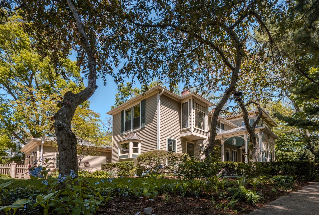 Step back in time as you enter this Prairie Italianate home built in 1864. One of the earliest homes built in Geneva, this residence embodies the charm of the Italianate movement, which was popular in affluent regions during the mid-19th century. Recognized in the Kane County Gazette as one of Geneva's finest homes! Nestled on a sprawling lot, in-town Geneva, adorned with 35 mature trees the property offers a serene and picturesque setting. A tranquil koi pond and cascading waterfall enhance the natural charm. Two expansive wraparound porches invite you to relax while enjoying morning coffee or hosting an evening dinner. The original home faced the river which today serves as the backyard and the back of the home now faces Fifth with the addition of a large 4 car tandem garage. There is an abundance of storage in the garage, a newly fenced yard and newer exterior paint and roof. Inside, you will find intricate decorative moldings that highlight the home's elegance and attention to detail. The 11-foot ceilings create an airy, grand atmosphere, while the hardwood floors throughout add warmth and beauty. You will want to host elegant dinners in the dining room, retreat to the library with your favorite book and relax in the family/living rooms. The updated kitchen provides plenty of space to gather and create wonderful family meals. Up the curved staircase you will find plenty of bedrooms / baths for your family and guests. Enjoy the Geneva library, plenty of quaint shops, restaurants and train ~ everything Geneva offers. Make this your home - a living piece of Geneva history!