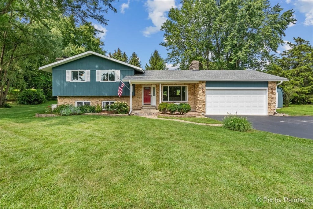 Set on a .91-acre corner lot with a long private driveway, this custom-built tri-level at 40W414 Guthrie Court blends land, character, and timeless design. Inside, warm oak doors frame a bright living room with a striking gas fireplace, while the dining area flows into a kitchen highlighted by a one-of-a-kind live-edge wood countertop. The primary suite opens directly to a private deck-perfect for morning coffee or evening relaxation-while additional bedrooms and flex rooms offer space for guests, office, or creative use. The lower level is a true retreat, featuring a dramatic floor-to-ceiling wood-burning stone fireplace accented by an exposed wood beam, setting the stage for gatherings, movie nights, or quiet evenings by the fire. Just steps below, the sub-basement offers a laundry room and work area, where the same custom beam detail continues-bringing warmth and character to even everyday spaces. Nearly an acre of outdoor space invites entertaining, gardening, or recreation-complete with an outdoor firepit for crisp fall nights surrounded by privacy and nature. A newer roof (2 years old) and a home warranty included at closing provide peace of mind. Ideally located minutes to I-90, Randall Road, and Big Timber train station, with Algonquin Commons shopping just 8 miles away. A rare chance to own a property that blends land, craftsmanship, and convenience in one remarkable package.