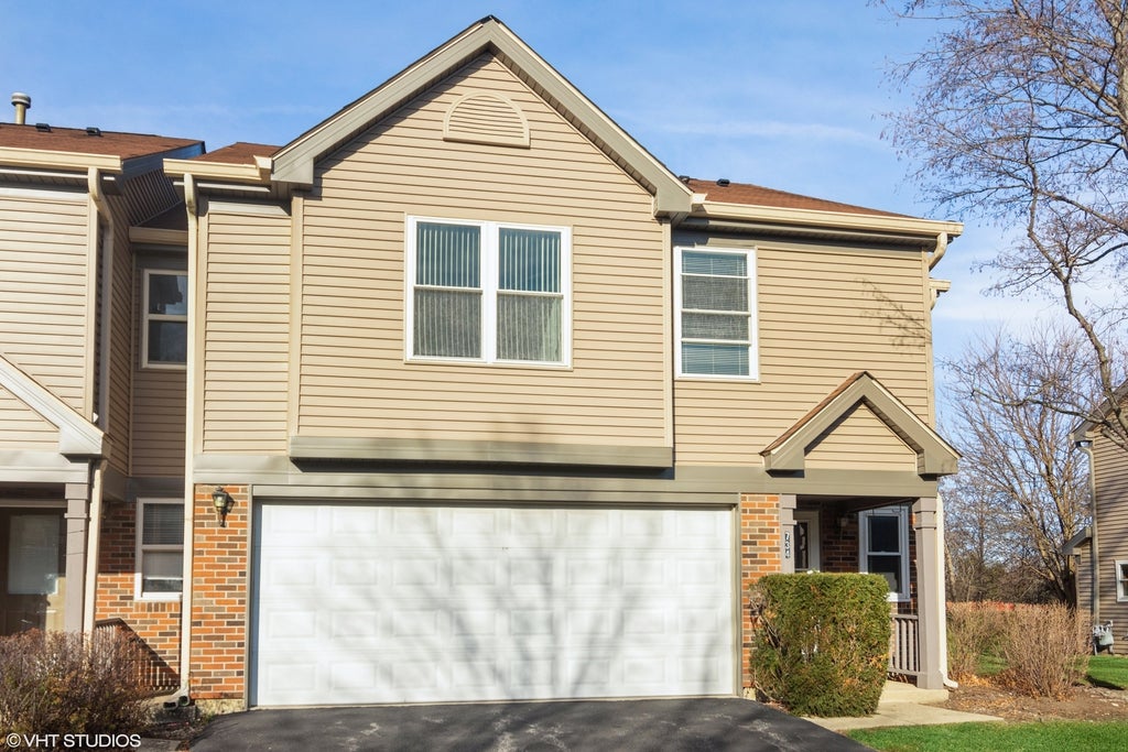 Welcome to this spacious and sunny 3-bedroom, 2.5-bath townhome with a 2-car attached garage in the highly desirable Whispering Oaks community. The dramatic two-story living room features soaring ceilings, a cozy fireplace, skylights, and southern exposure that fills the space with natural light. The eat-in kitchen offers a sliding door to the private patio, perfect for relaxing or entertaining, while backing to the park for privacy and open views. Upstairs, you'll find the private master suite with its own bath, two additional bedrooms, a hall bath, and the convenience of second-level laundry with washer and dryer. Recently updated, this beautiful home is move-in ready and ideally located near schools, shopping, the train, Falcon Park Recreation Center, and with quick access to both Rand Road and Route 53.